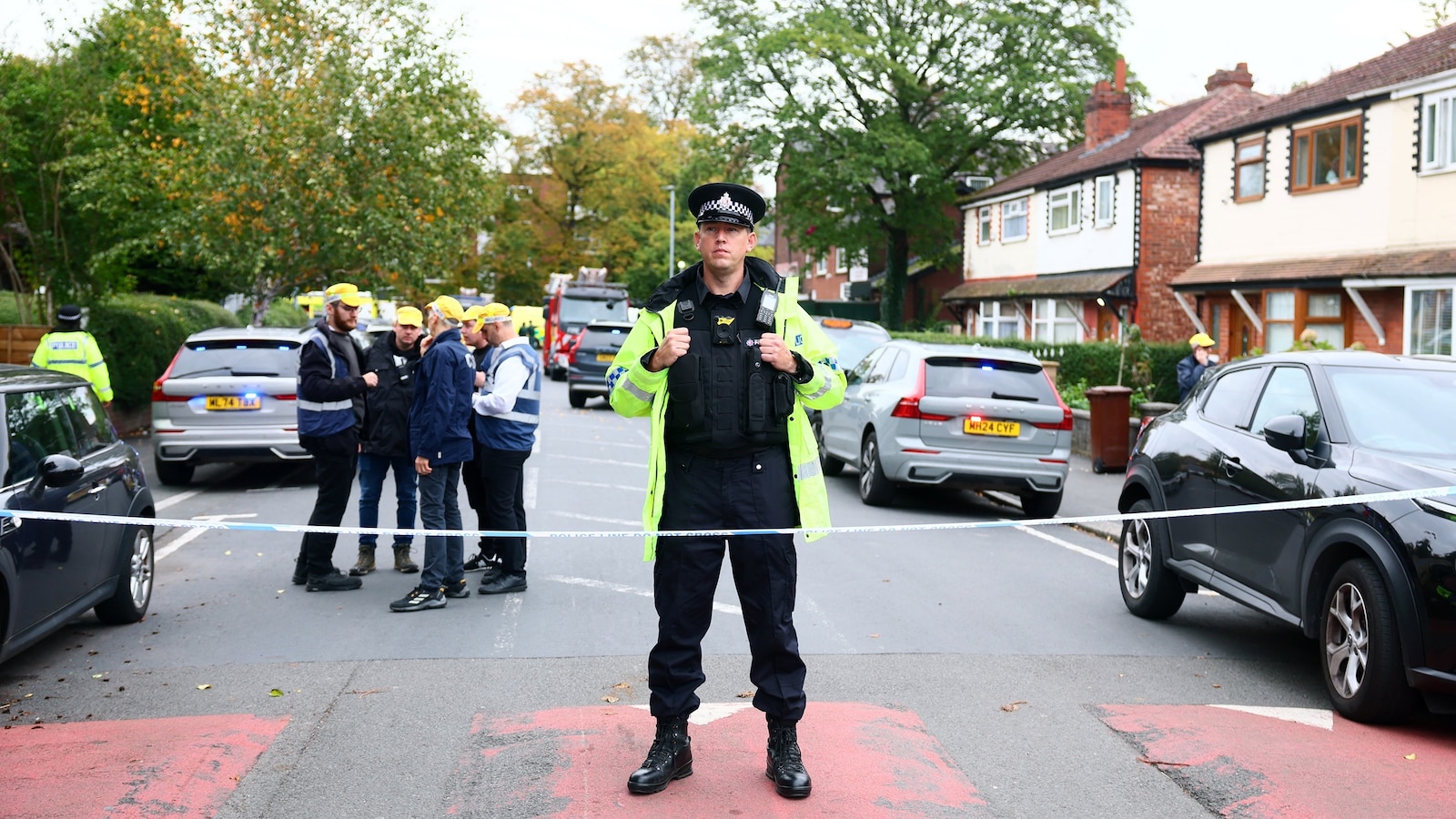 LONDON -- A vehicle was driven toward a crowd of people and a man was stabbed near a synagogue in Manchester, a northern British city, police said."One man has been shot, believed to be the offender," the Greater Manchester Police said on social media.The incident occurred outside the Heaton Park Hebrew Congregation Synagogue in a northern suburb of the city on Thursday morning, law enforcement said.Emergency personnel work in a cordon on Middleton Road following an incident outside a synagogue in north Manchester, Britain, Oct.2, 2025.Phil Noble/ReutersPolice said at least four people had been injured, "with injuries caused by both the vehicle and stab wounds." A member of the public told responding officers "he had witnessed a car being driven towards members of the public," along with a man being stabbed, police said.Firearms officers responded to the call, police said.Police said they had declared the major incident, along with a "PLATO" designation, a law enforcement shorthand that means the incident was being treated as a potential marauding terrorist attack.Emergency services at the scene of a stabbing incident at Heaton Park Hebrew Congregation synagogue, in Crumpsall, Manchester, England, Thursday Oct.